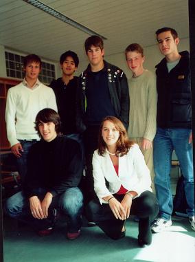 | Die ersten Comenius-Teilnehmer aus unserer K 12: Vorne von links: Robert Sturm (Theaterschmiede Bobingen) und Marion Fleischer (Theater Kleinaitingen) Hinten: Tobias Fünfer (Parktheater), Pascal Tran (Singoldhalle Bobingen), Florian Haas und Benjamin Girr (Komödie Augsburg) und Florian Burkert (Webmaster) | Unsere Comenius-Theater-AG: Manuel Ried (11. Klasse) und Marina Schnitzler (K 13) als Romeo und Julia | Die Projektleiter Werner Altmann, Stephan Janosi, Dieter Ungelehrt und Henrik Schlobat (hinten) |